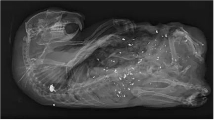 X-ray of prairie dog shot in Thunder Basin National Grasslands in 2017. The white specs represent lead fragments.